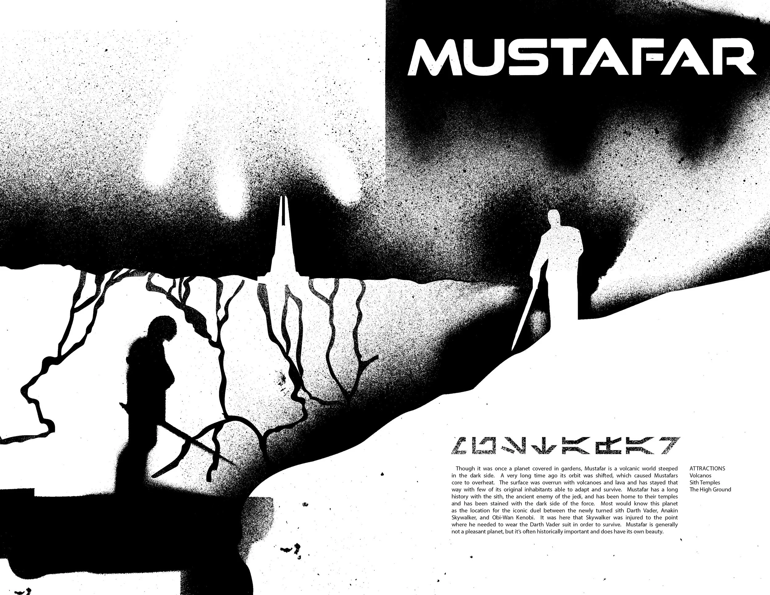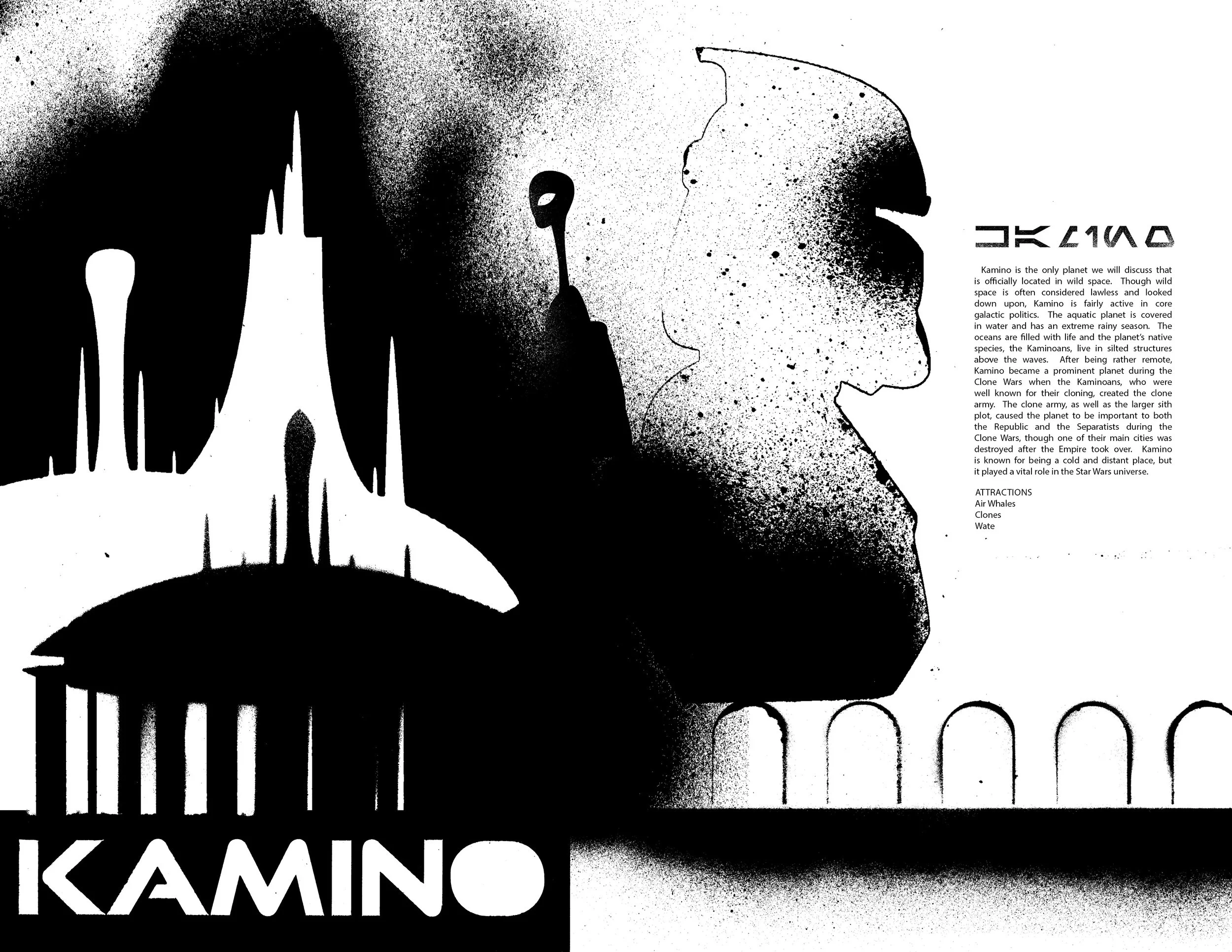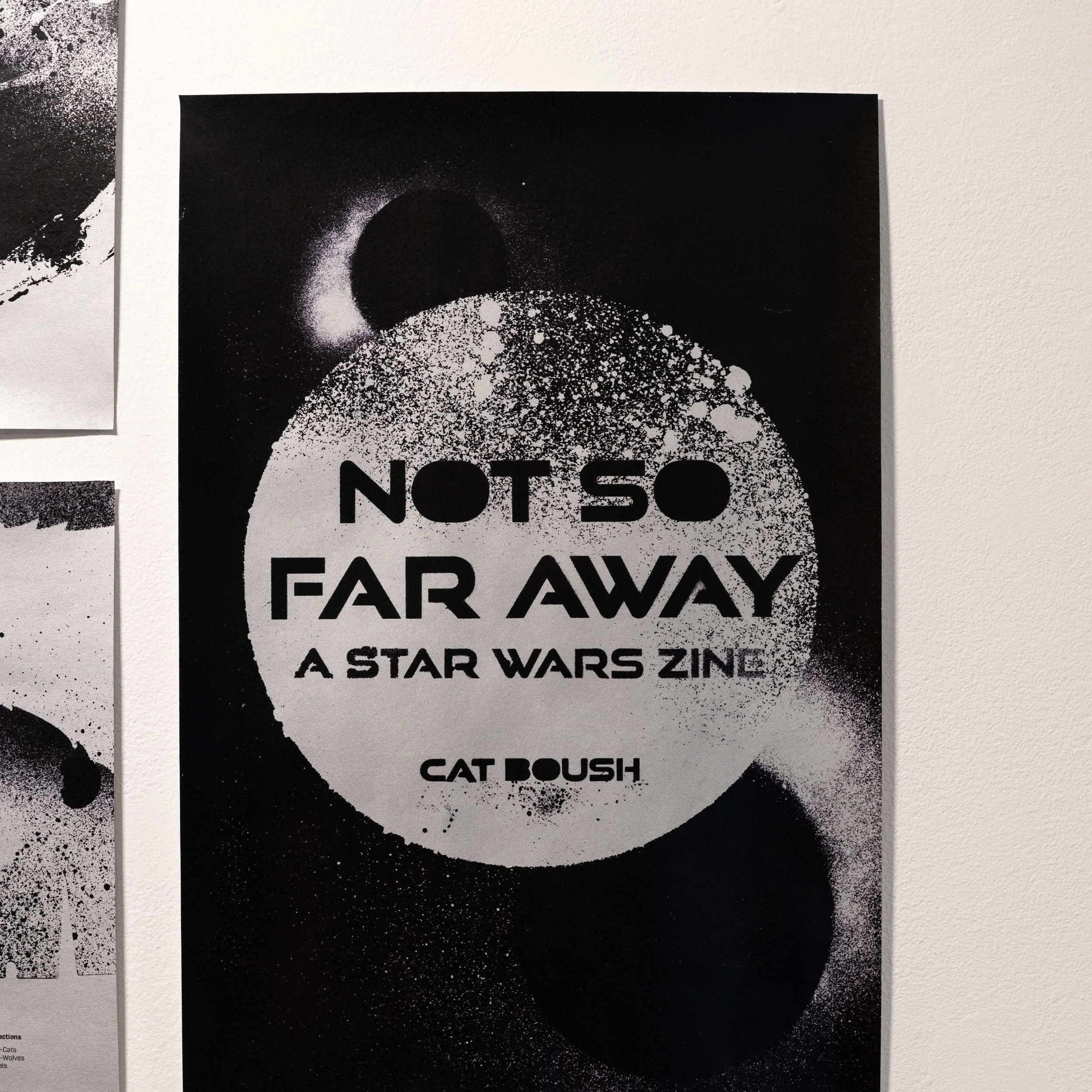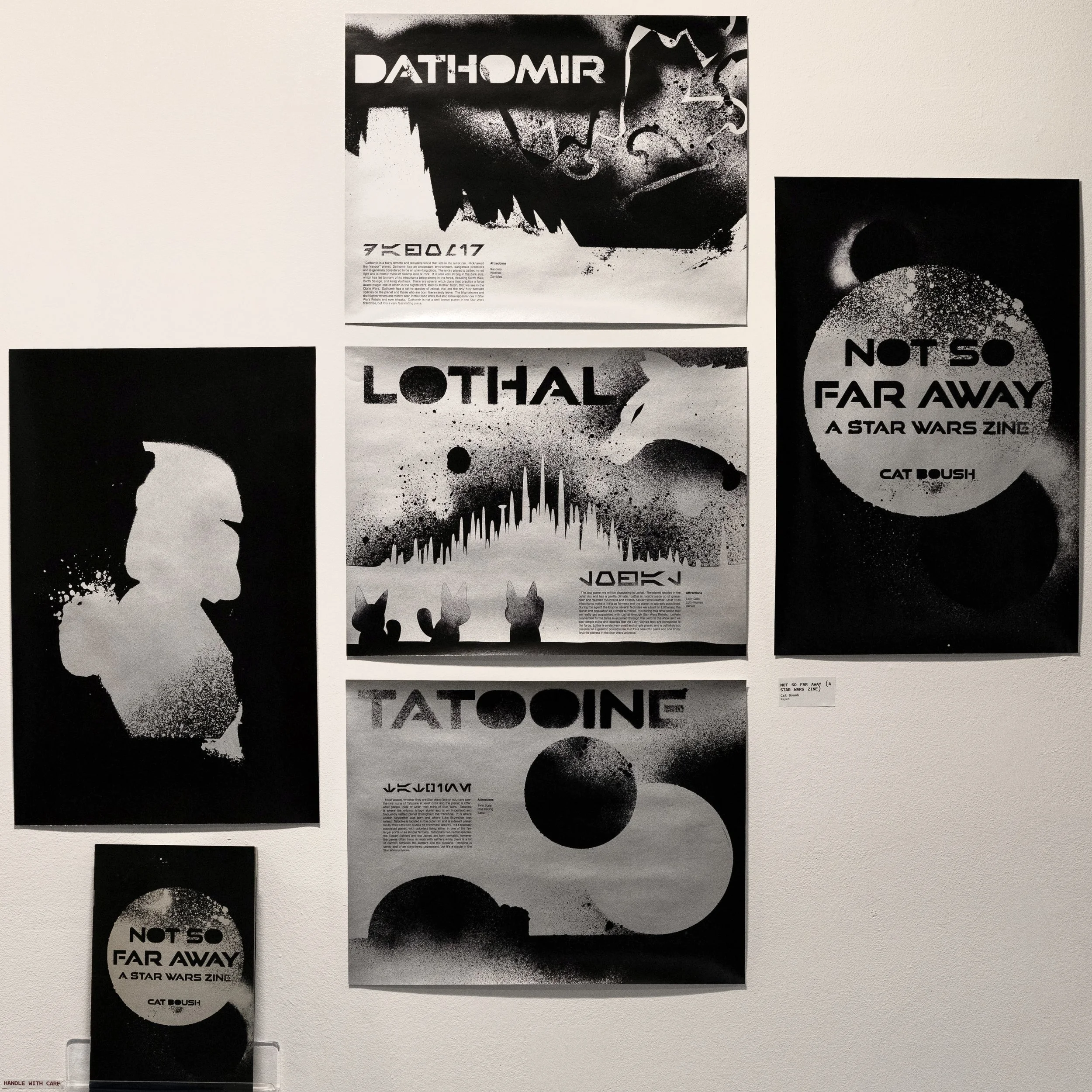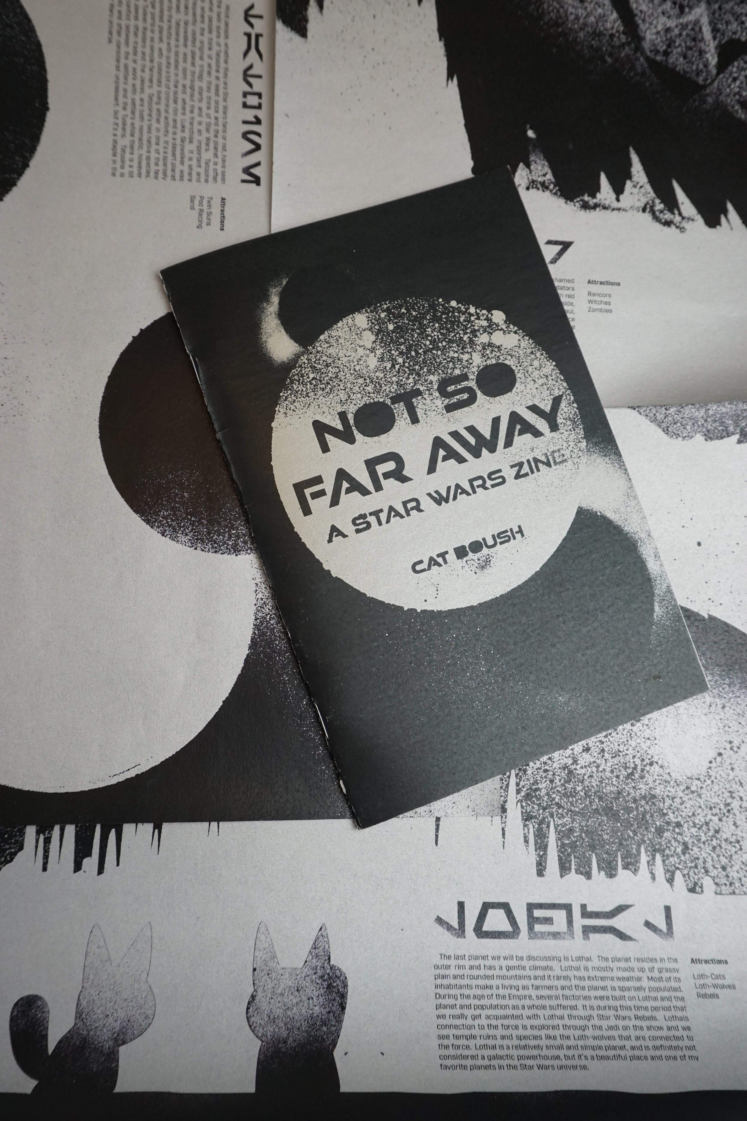 Not So Far Away is a Star Wars zine that hopes to bring the far off galaxy a little closer to its readers. The zine is centered around the Star Wars universe rather than a specific film or series. Over the years the Star Wars world has grown and expanded into a detailed universe. Though the current canon is a bit chaotic, there’s still so much to explore. Not So Far Away aims to highlight certain aspects of the Star Wars universe. It’s meant to be enjoyable and comprehensible to everyone, from hardcore fans to casual enjoyers. Though the zine could explore a variety of Star Wars centric topics in the future, the first edition shows different worlds within the Star Wars universe, from the well-known Tatooine to the more elusive Dathomir. Each spread focuses on one planet, and features a visual representation, a short description, and three ‘attractions’. All of Not So Far Aways’ visual graphics were spray painted in order to draw from the grungier side of Star Wars that we often see and the zine was printed on metallic silver paper.